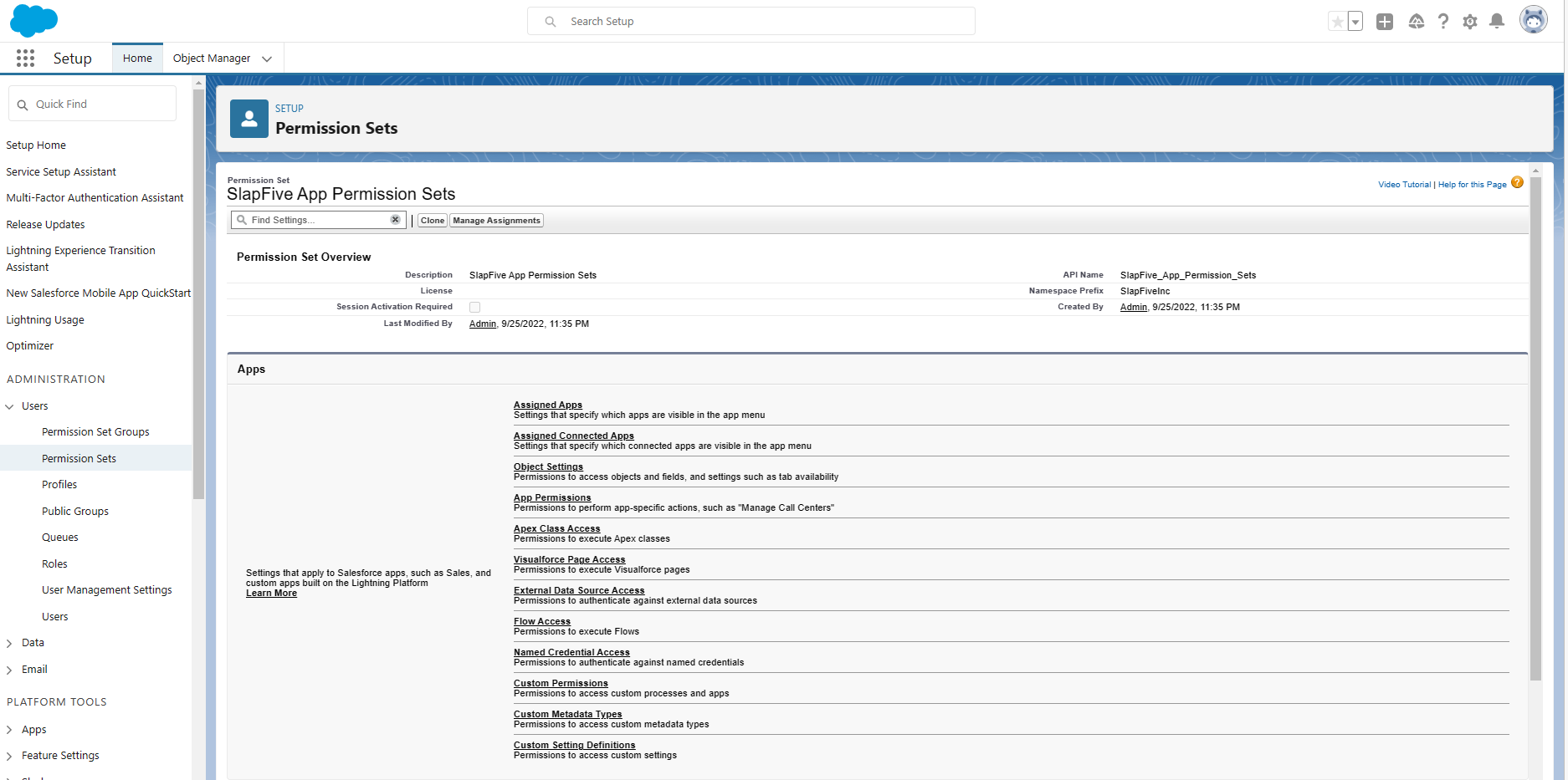 Any Salesforce User who needs access to the SlapFive Salesforce App components needs to be assigned to the SlapFive App Permission Set. You can also put the SlapFive App Permission Sets into a **Permission Sets Group** and assign users to that Group.
