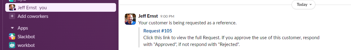 1. Work with your SlapFive technical account manager to design the workflow trigger and actions. For example, the trigger could be that a customer has been selected to fulfill a request, the action is then to get permission from that customer's CSM or AM to use them to fulfill that request.
