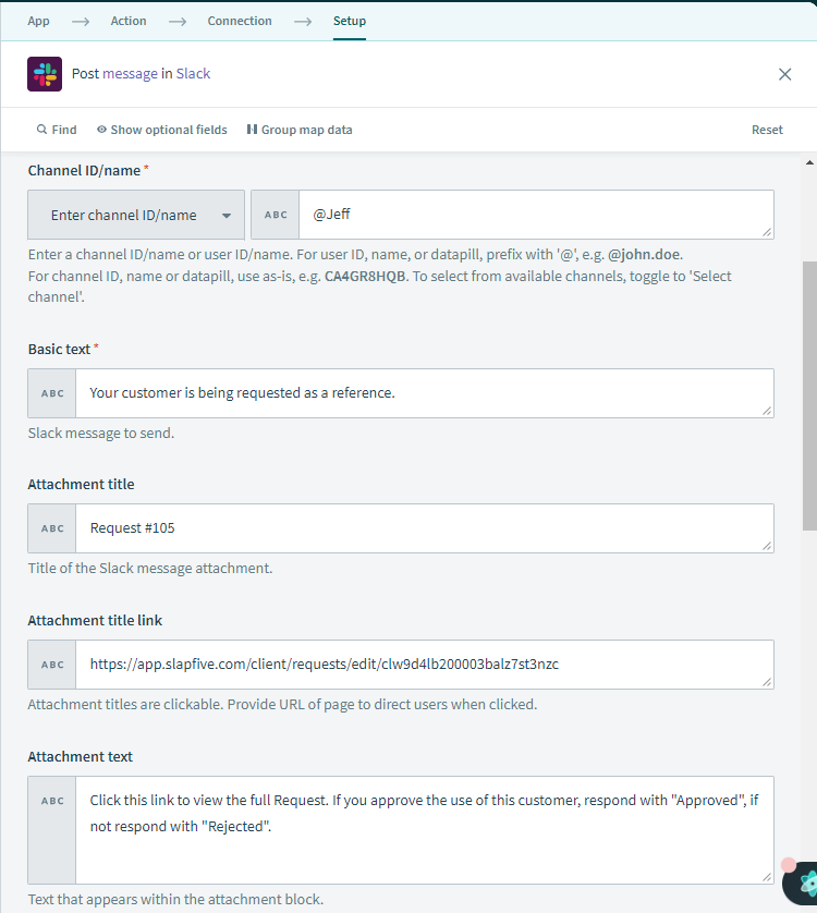 Here are the steps required for SlapFive to set up the automated workflow that sends messages to Slack users: